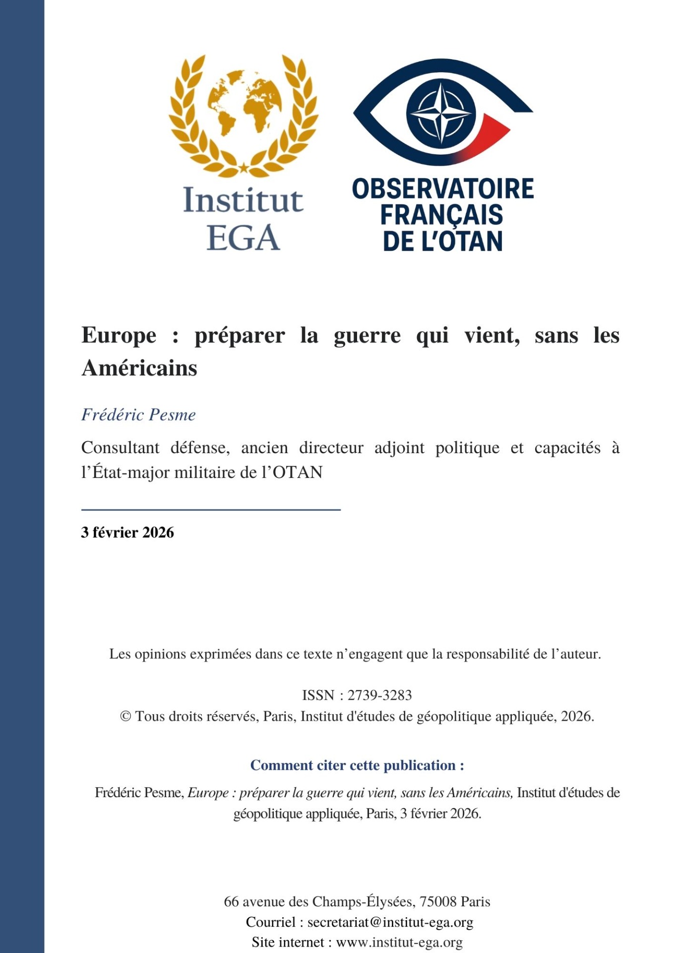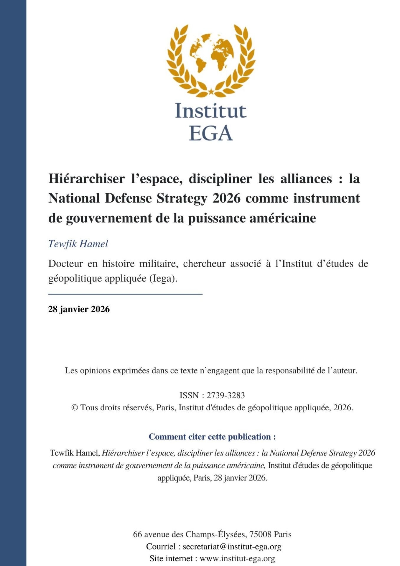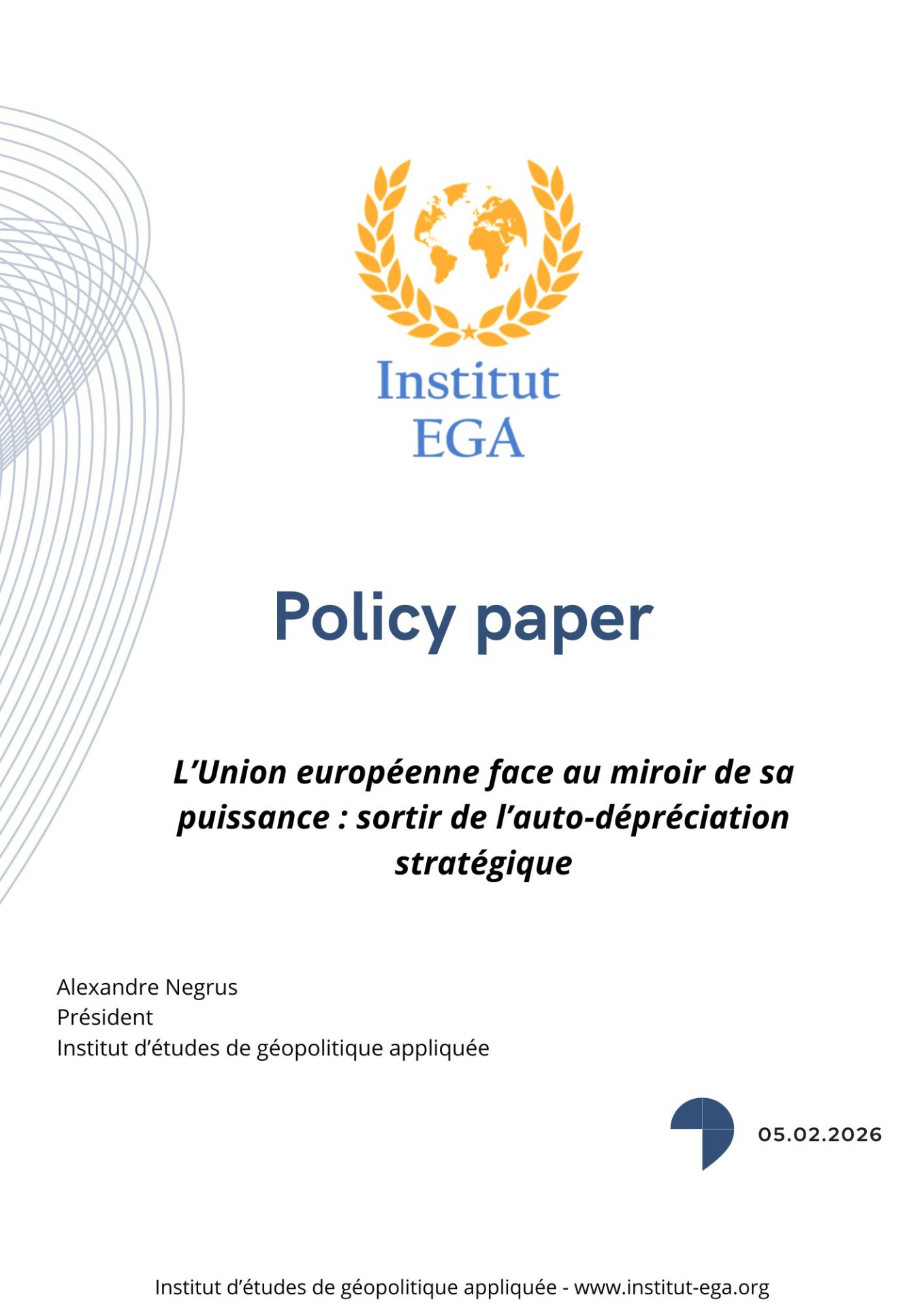 Fondé en 2015, l'Institut d'études de géopolitique appliquée (Iega) est un think tank reconnu en France pour son expertise dans l'analyse des relations internationales, des enjeux géopolitiques et des dynamiques diplomatiques contemporaines. Organisme d'intérêt général, l'Iega se consacre à la production d'analyses rigoureuses, à l'information du public, ainsi qu'à la formation et au conseil auprès d'acteurs publics et privés, incluant les milieux économiques, institutionnels et diplomatiques. Animé par une exigence d'indépendance intellectuelle et de rigueur analytique, l'Iega poursuit l'ambition de fédérer la société civile, les décideurs institutionnels et la communauté scientifique autour des grands enjeux géopolitiques.