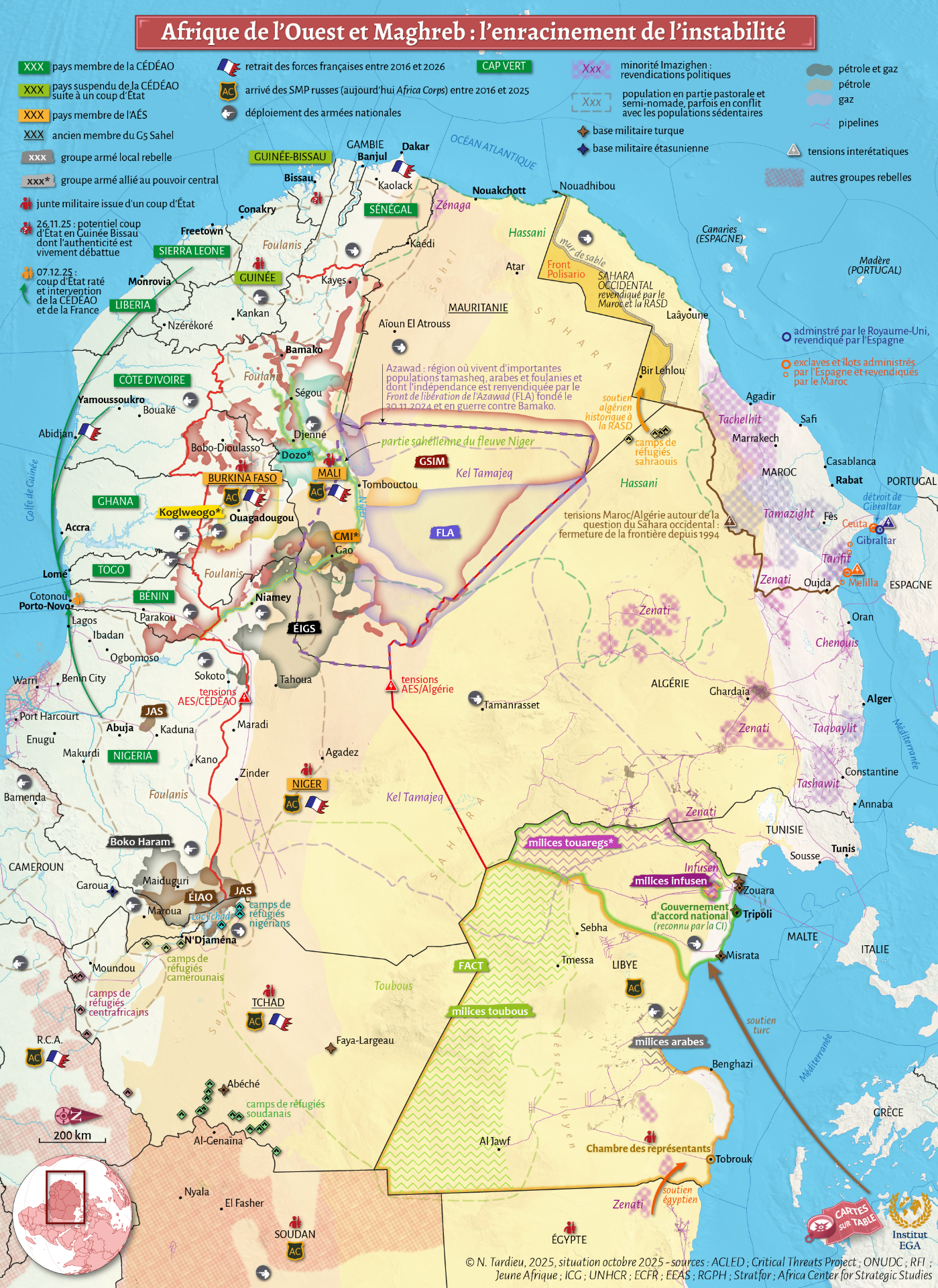 Cette nouvelle carte produite par Nato Tardieu, directeur du département cartographie de l'Iega, illustre l'enracinement de l'instabilité en Afrique de l'Ouest et au Maghreb. Elle figurera dans notre ouvrage collectif à paraître en septembre prochain aux Éditions Ellipses.