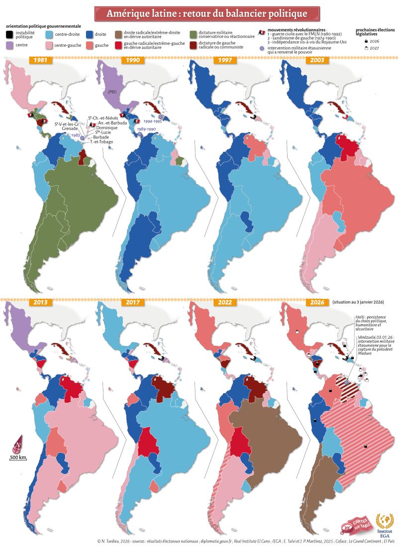 Cette nouvelle carte, produite par Nato Tardieu, directeur du département de cartographie de l'Iega, illustre le retour du balancier politique en Amérique latine dans un contexte de tensions régionales croissantes. Elle figurera dans notre ouvrage collectif à paraître en septembre prochain aux Éditions Ellipses.