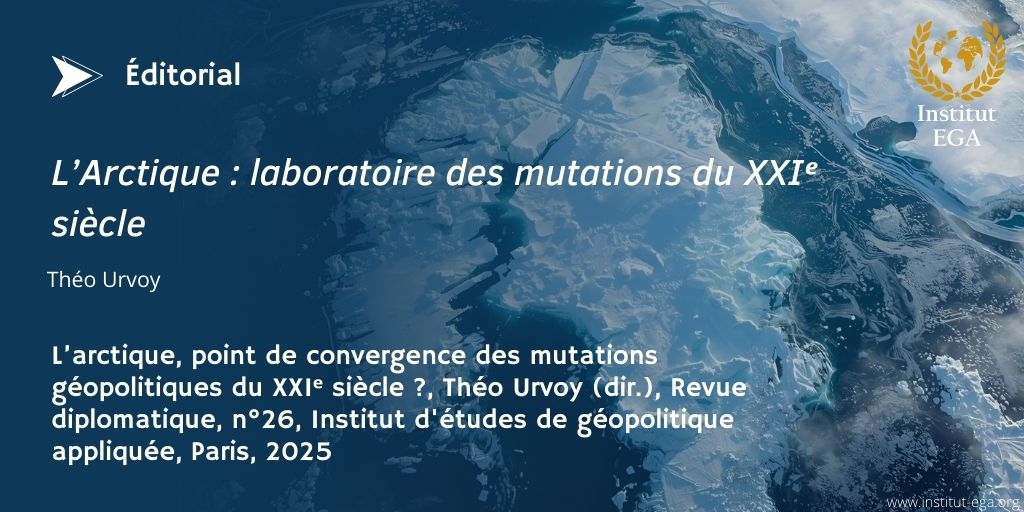 Urvoy, Théo. « L'Arctique : laboratoire des mutations du XXIᵉ siècle », éditorial dans L'Arctique : point de convergence des mutations géopolitiques du XXIᵉ siècle ?, Théo Urvoy (dir.), Revue diplomatique, n°26, Institut d'études de géopolitique appliquée, Paris, 2025.