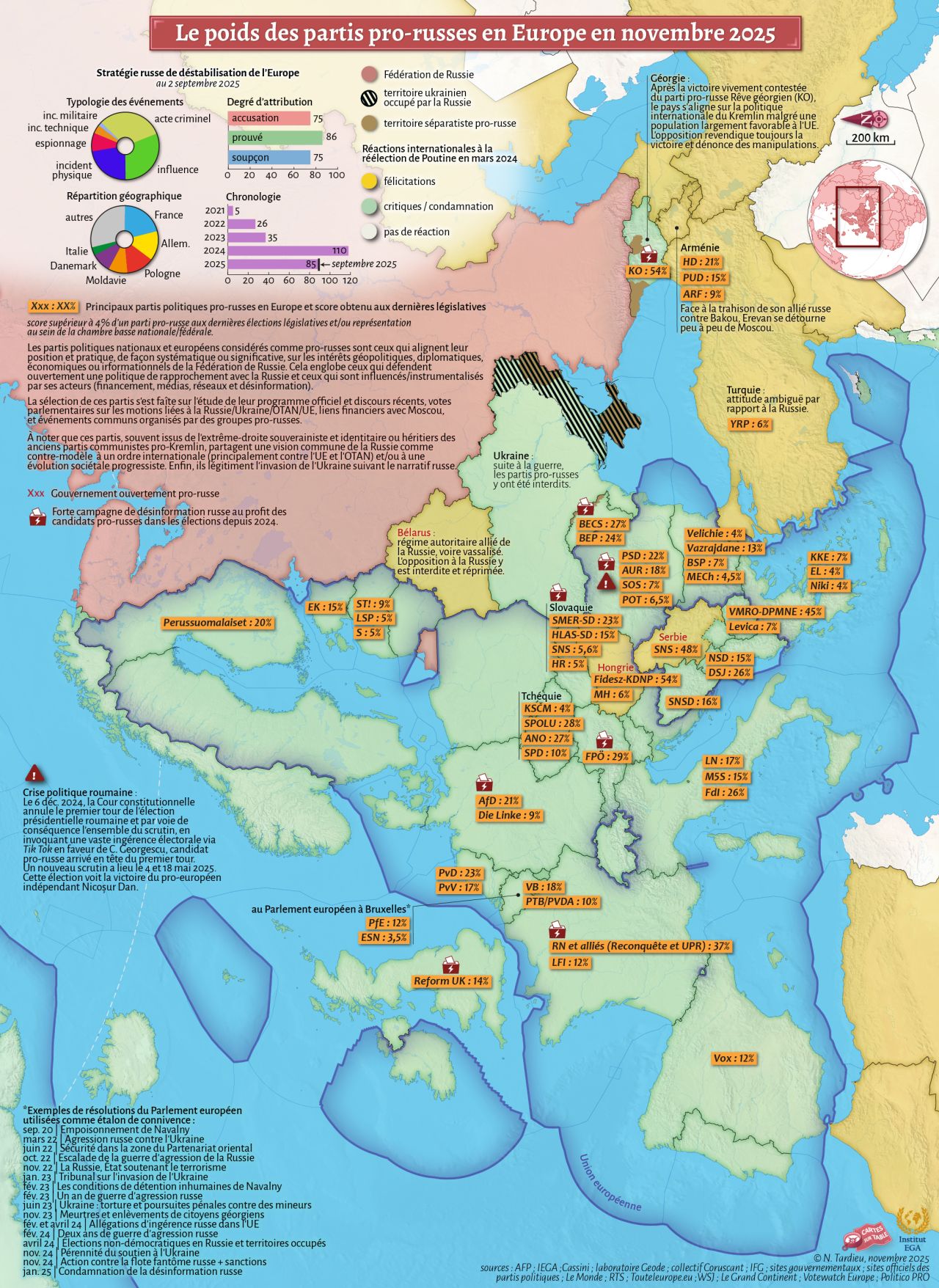 L'enjeu de ce scrutin dépasse les frontières nationales. La carte répertorie les partis pro-russes selon leur propension à contester le récit européen sur l'invasion de l'Ukraine et à bloquer les sanctions. Une reconduction massive de Viktor Orbán, qui bénéficie d'un soutien affirmé de la part de l'administration américaine (ouvertement hostile aux démocraties libérales européennes), confirmerait la Hongrie comme le principal verrou aux initiatives de défense commune de l'Union.