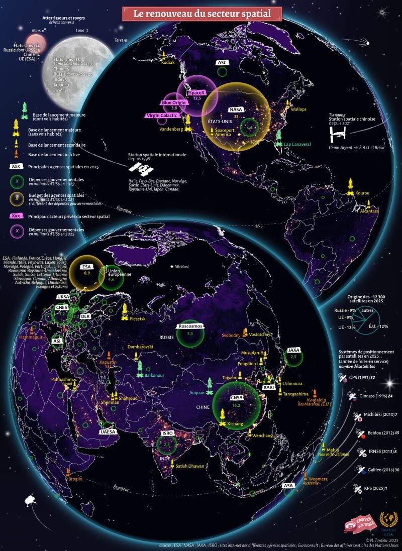 Cette nouvelle carte, issue de notre ouvrage collectif à paraître en septembre prochain aux Éditions Ellipses et produite par Nato Tardieu, directeur du département de cartographie de l'Iega, illustre le renouveau du secteur spatial à l'échelle mondiale.