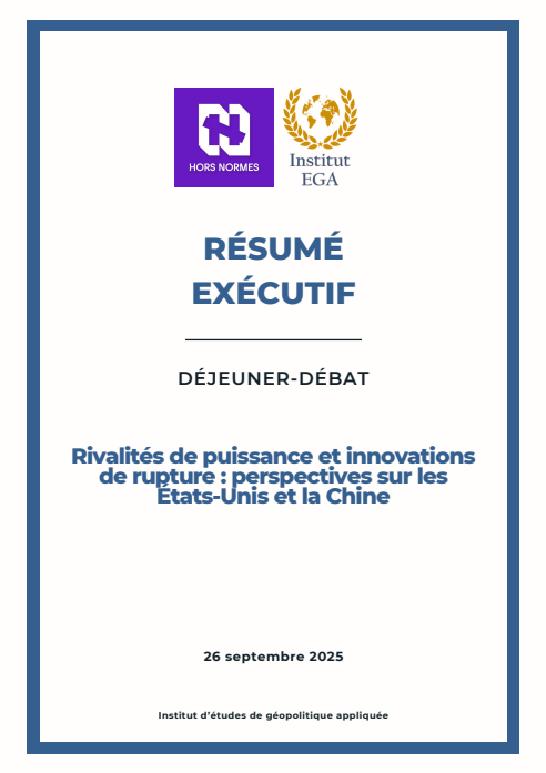 Résumé exécutif d'un événement co-organisé par le média Hors normes et l'Institut d'études de géopolitique appliquée (Iega) qui a réuni des experts et décideurs autour de Pierre Haski, chroniqueur géopolitique à France Inter et au magazine L'Obs, pour explorer les rivalités de puissance et innovations de ruptures sur les États-Unis et la Chine.